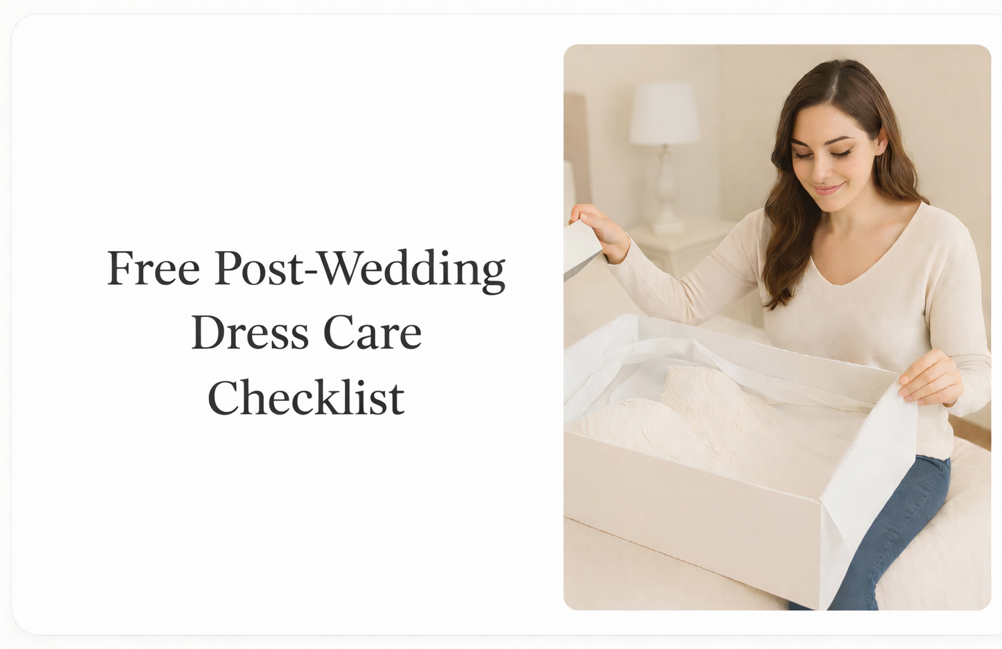 Download our free printable “Post-Wedding Dress Care Checklist” to make sure your gown stays safe from stains, dust, and damage for years to come.