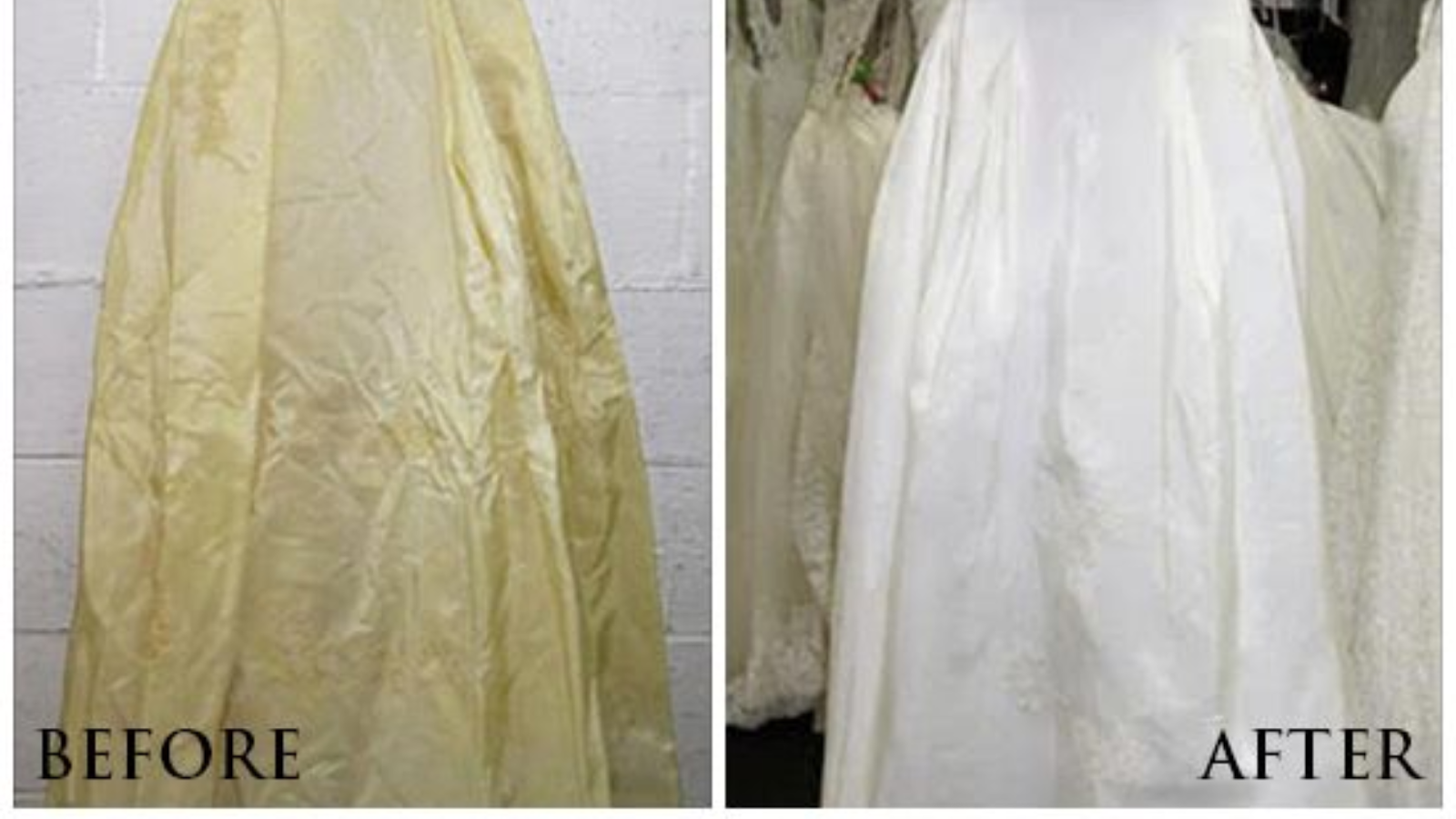 Here’s a “Before & After” version of a wedding gown thoroughly cleaned at our facility.