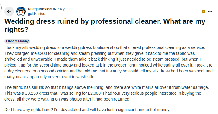 Another Reddit bride’s gown came back from the cleaner looking like it had been through a hot wash; with the corset wrecked, seams torn, and fabric left beyond repair.