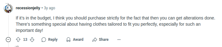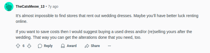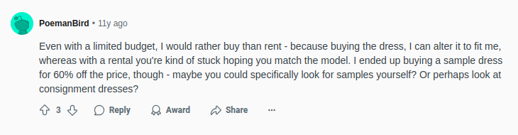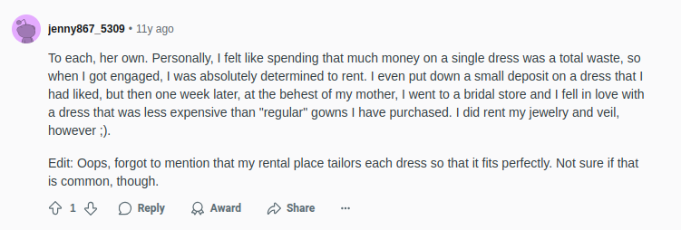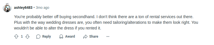 Again, there’s this Reddit bride who is favoring the idea of buying a secondhand wedding dress because no bride-to-be wants to face the hassles of altering rental dresses.