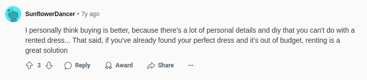 Sunflowerdancer, again, a Reddit bride shared that buying is better because it gives you complete freedom for customizations and alterations.