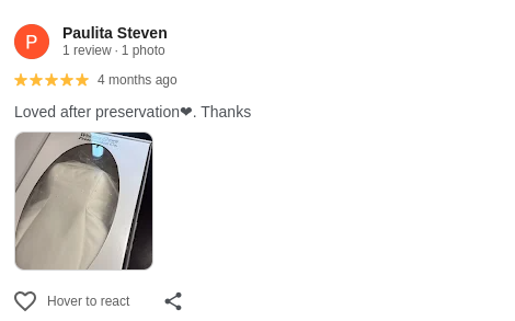 Concerned about maintaining the gown’s quality and longevity, Paulita sought expert cleaning and preservation to ensure her dress would remain a pristine keepsake for years to come.