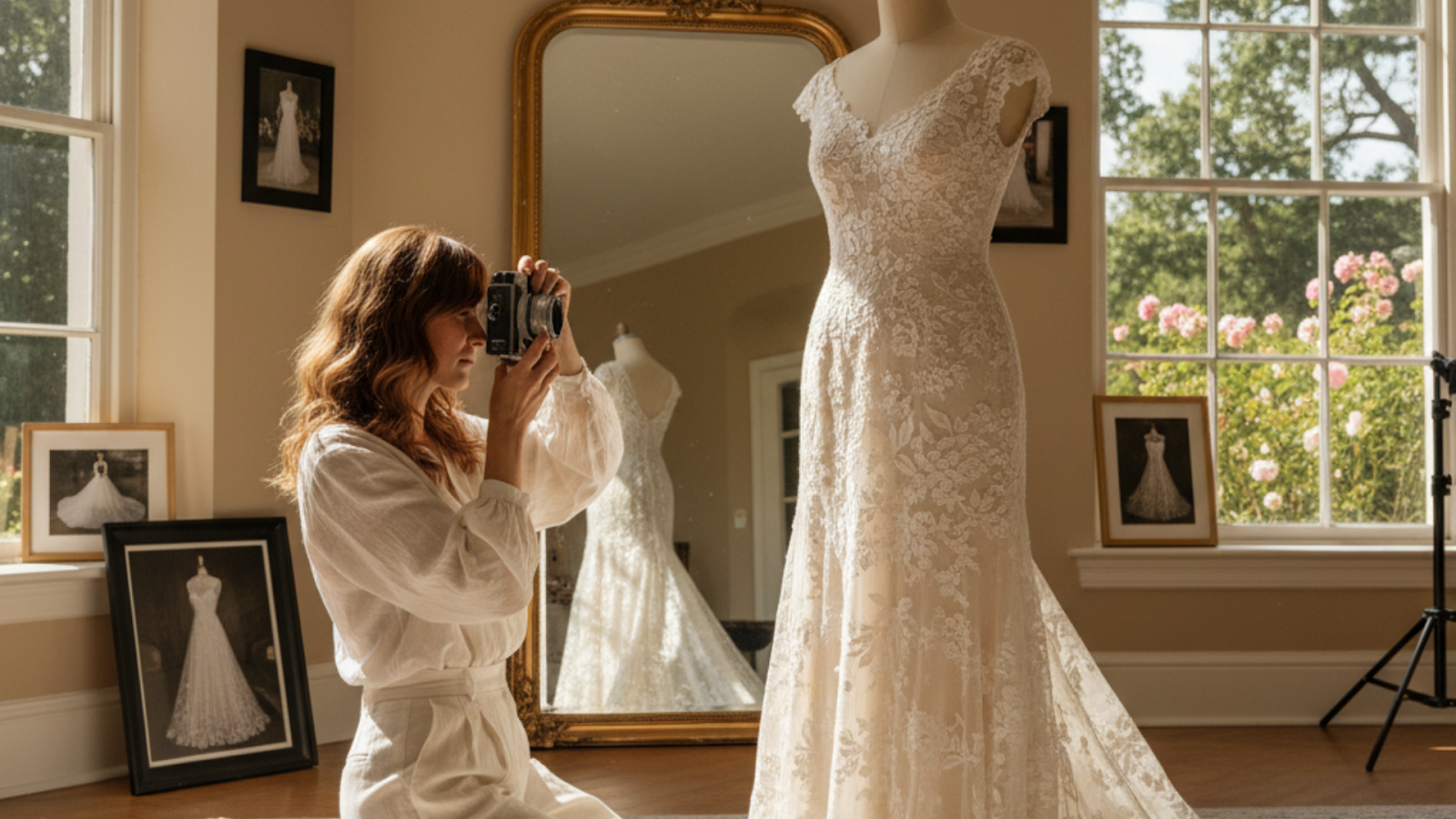 To capture the best photos, use natural light that shows the gown’s true colors and details. Take pictures from the front, back, and sides. Also, take a close-up of lace, beading, or embroidery, if any.