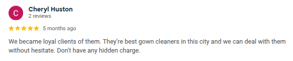 “We became loyal clients of them. They’re best gown cleaners in this city and we can deal with them without hesitate. Don’t have any hidden charge”