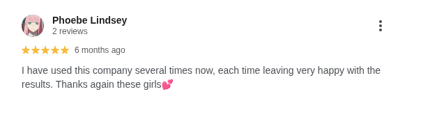 “I have used this company several times now, each time leaving very happy with the results. Thanks again these girls.”