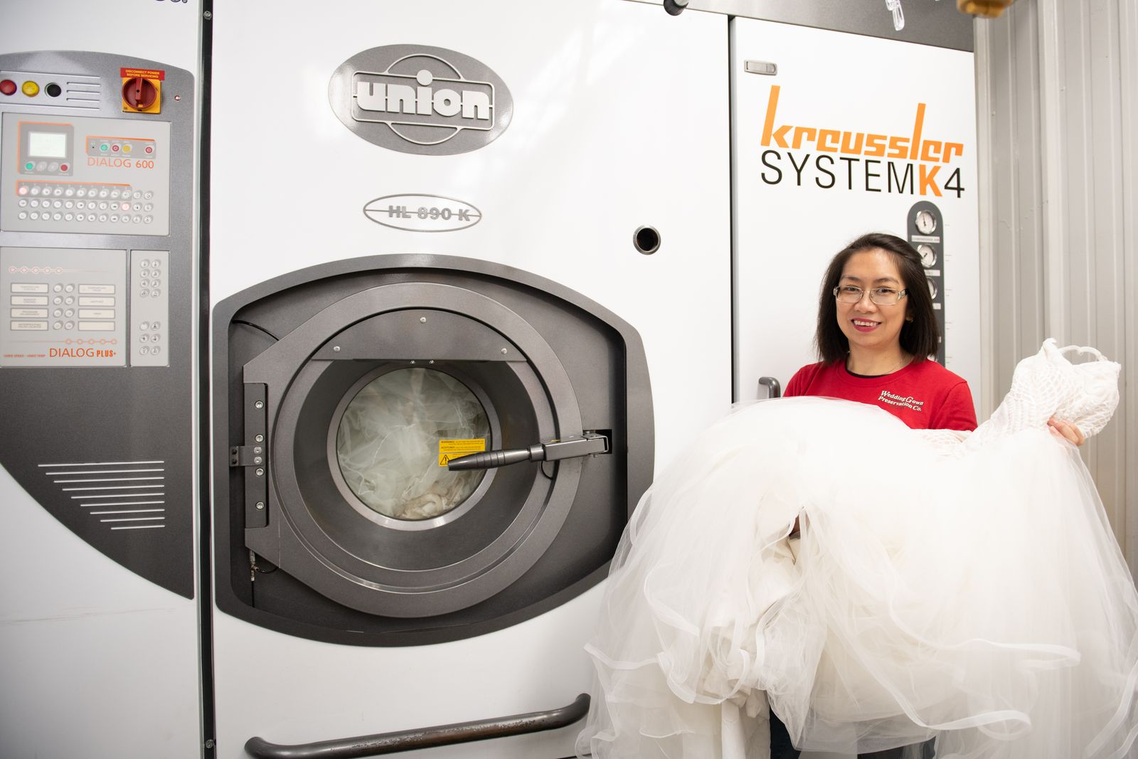 Once your gown is safely logged into our facility and carefully inspected for any stains or fabric damage, it proceeds through our specialized cleaning process using SYSTEMK4—a gentle, eco-friendly technology designed for treating delicate bridal fabrics. Say goodbye to stubborn wedding day stains with this gentle yet powerful process!