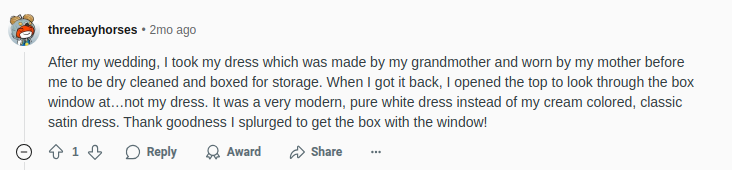 Another Reddit bride shared a heartbreaking story of a careless gown mix-up, which was a vintage one passed down from her grandmother and even worn by her mother.